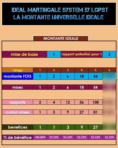 IDEAL MARTINGALE SYSTEM, cette calculatrice de mises par palier permet de créer autant de systèmes de mises qu'il y à de types de paris avec toutes leurs variantes, et en plus, pour un choix de critères définis, elle à l'outrecuidance de proposer le choix de trois versions de montantes.